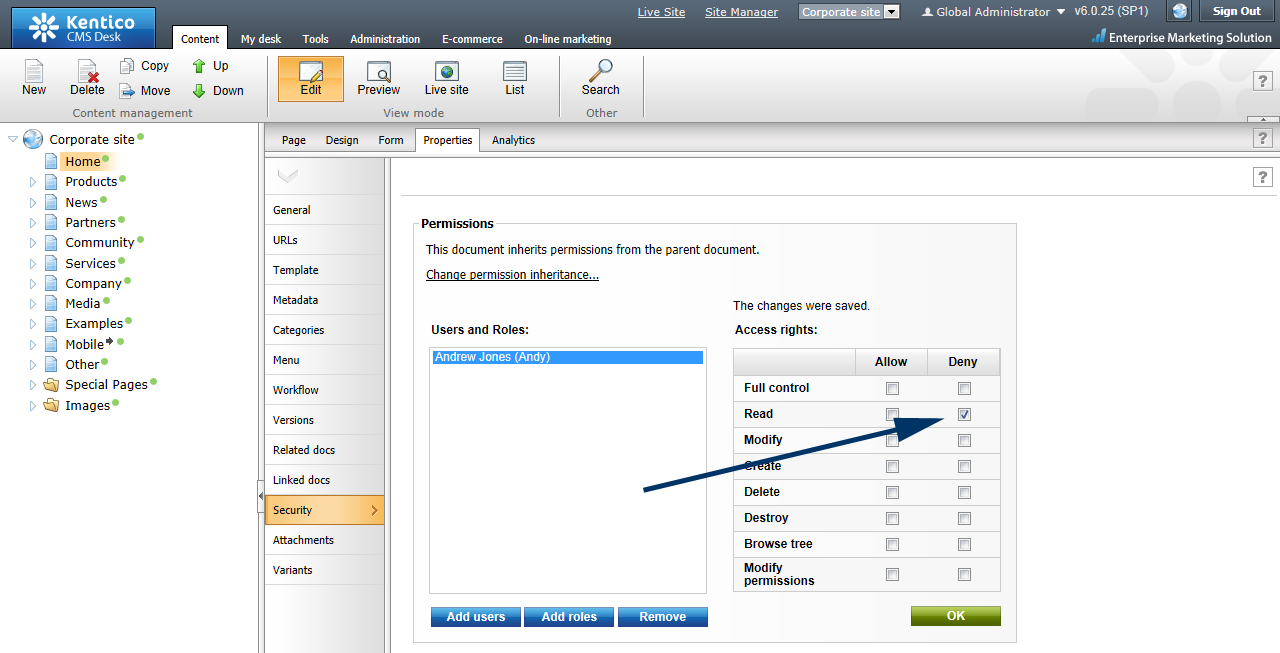 Notice that I denied Andy read permissions on the Home page.
