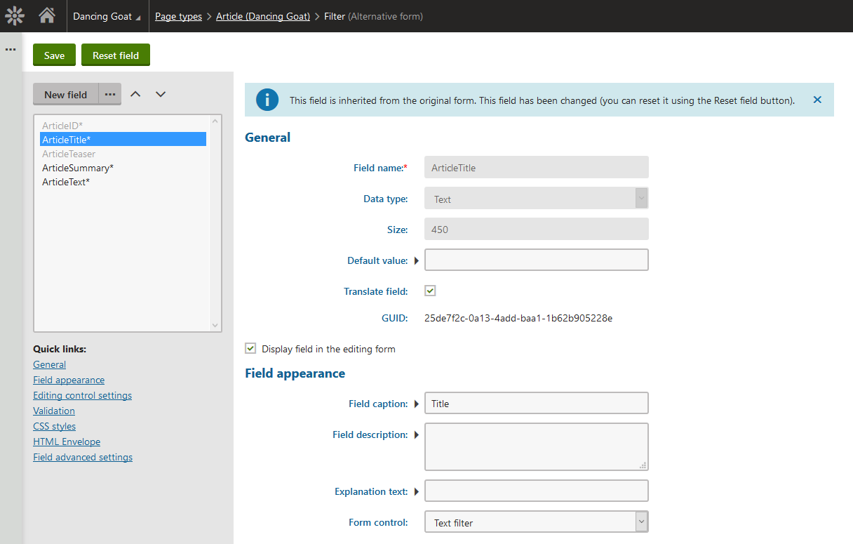 Step 1: Create the alternative form with code name "filter" for the page type that you want to enhance with additional filtering (in this example I will use the Dancing Goat Article).