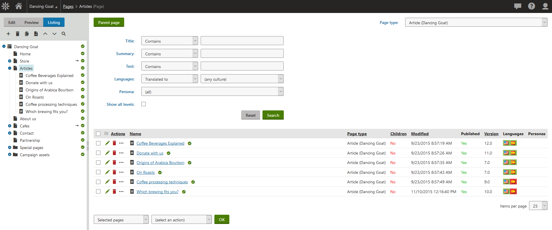 Step 3: View the result! Go to the Pages application --> Hit the "Listing" button and select the page type in the top right corner.