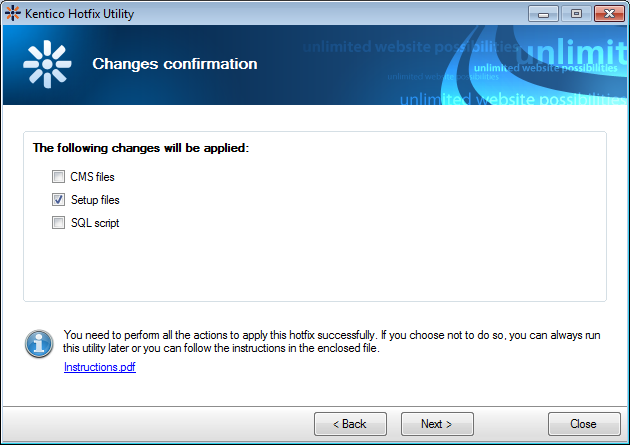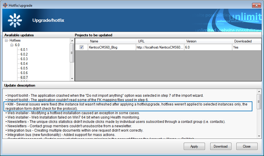 On the left you will see the available updates. If you select the 6.0.7 hotfix (or newer) and continue by clicking "Apply", the hotfix will be downloaded and you will be taken to the Kentico Hotfix Utitlity wizard.