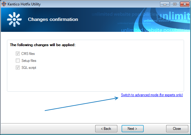 The image below shows step 3, and gives you an overview of the changes that will be applied. The list consists out of the options: CMS files, Setup files (only available from hotfix 6.0.7) and SQL script. Because you typically would only hotfix a website, the Setup files option is deselected. In order to select the Setup files option you will have to click on the: "Switch to advanced mode (for experts only)" link in the right corner.