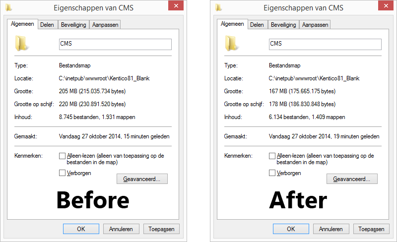 In addition I always recommend Kentico developers to: “choose your modules wisely”. This reduces the number of project files, saves disk space and results in faster build times. Using the Kentico Installer it’s easy peasy to unselect modules and exclude them from the installation. The screenshots below shows you the difference between a blank site with all modules (8.745 files, 220MB) and a blank site with a selection of the most common modules (6.134 files, 178MB). Makes sense to reconsider this right?