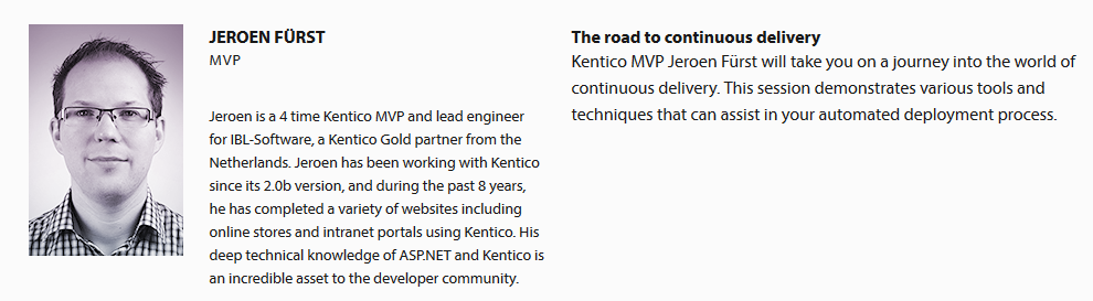 This will be my fifth connection and also the fifth time that I will be presenting a session. This time my session is about continuous delivery. The session is scheduled on the second day round 11:10 in the developer track, after Bryan's session: "Setting your project up for success with Kentico CMS 8". Looking forward to seeing you all again!